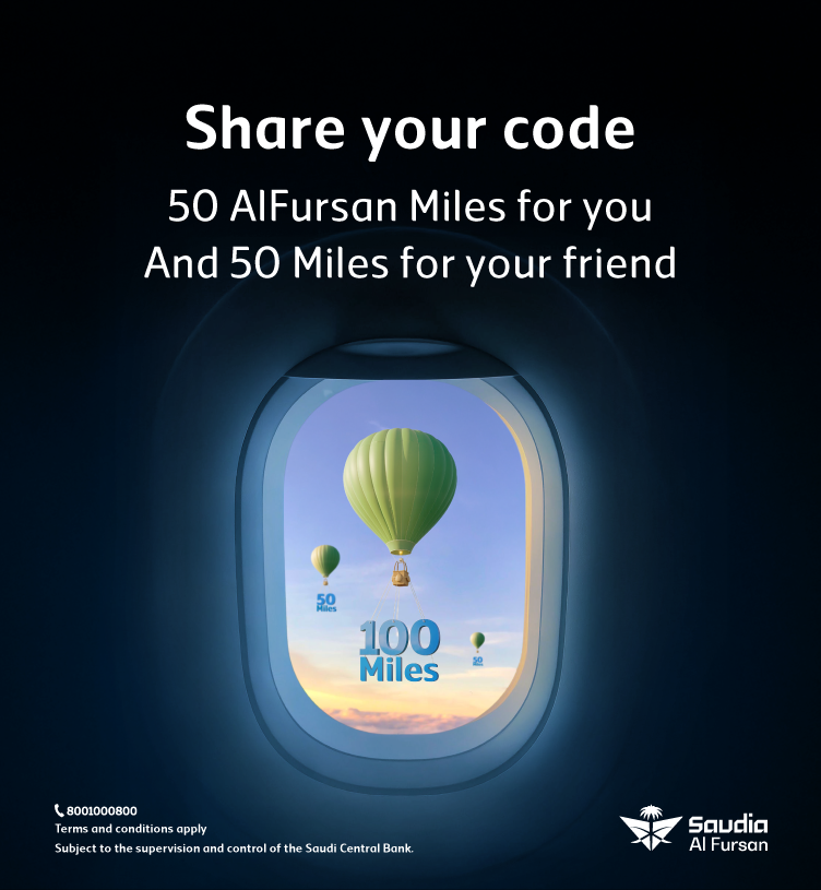 Share your promo code with friends,  you’ll get 50 AlFursan Miles, and they’ll get 50 Miles too